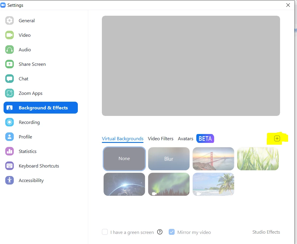 I am currently using the Basic zoom plan. I am unable to change my virtual background. I have clicked on the "+" but nothing happens:
